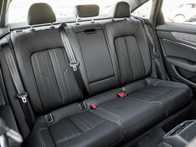 The A6 S line makes a bold statement with the Black Optic Sport Package, including 20 10-spoke-star design wheels in platinum gray finish, black exterior trim, and sport suspension with a 20mm lower ride height. Black Audi rings and model badge further refine its sleek appearance, while the Audi Beam Rings illuminate the pavement with signature flair.