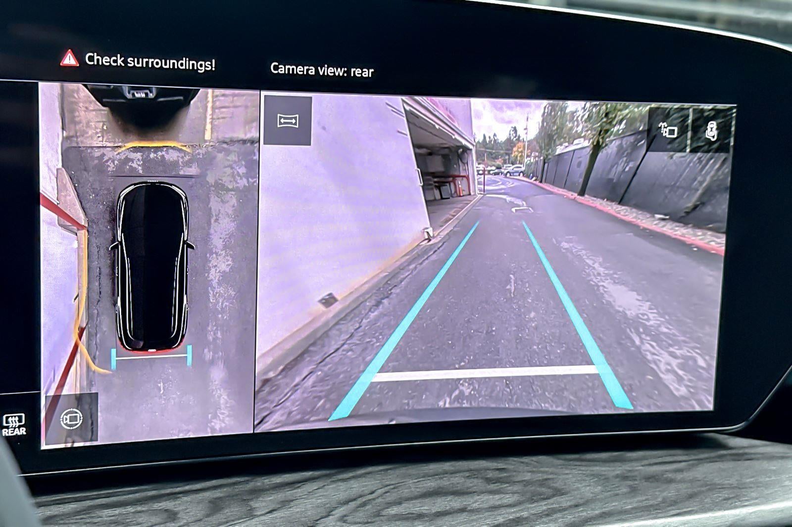 - The vehicle is equipped with a camera that displays an image of the area behind the vehicle on an interior display.