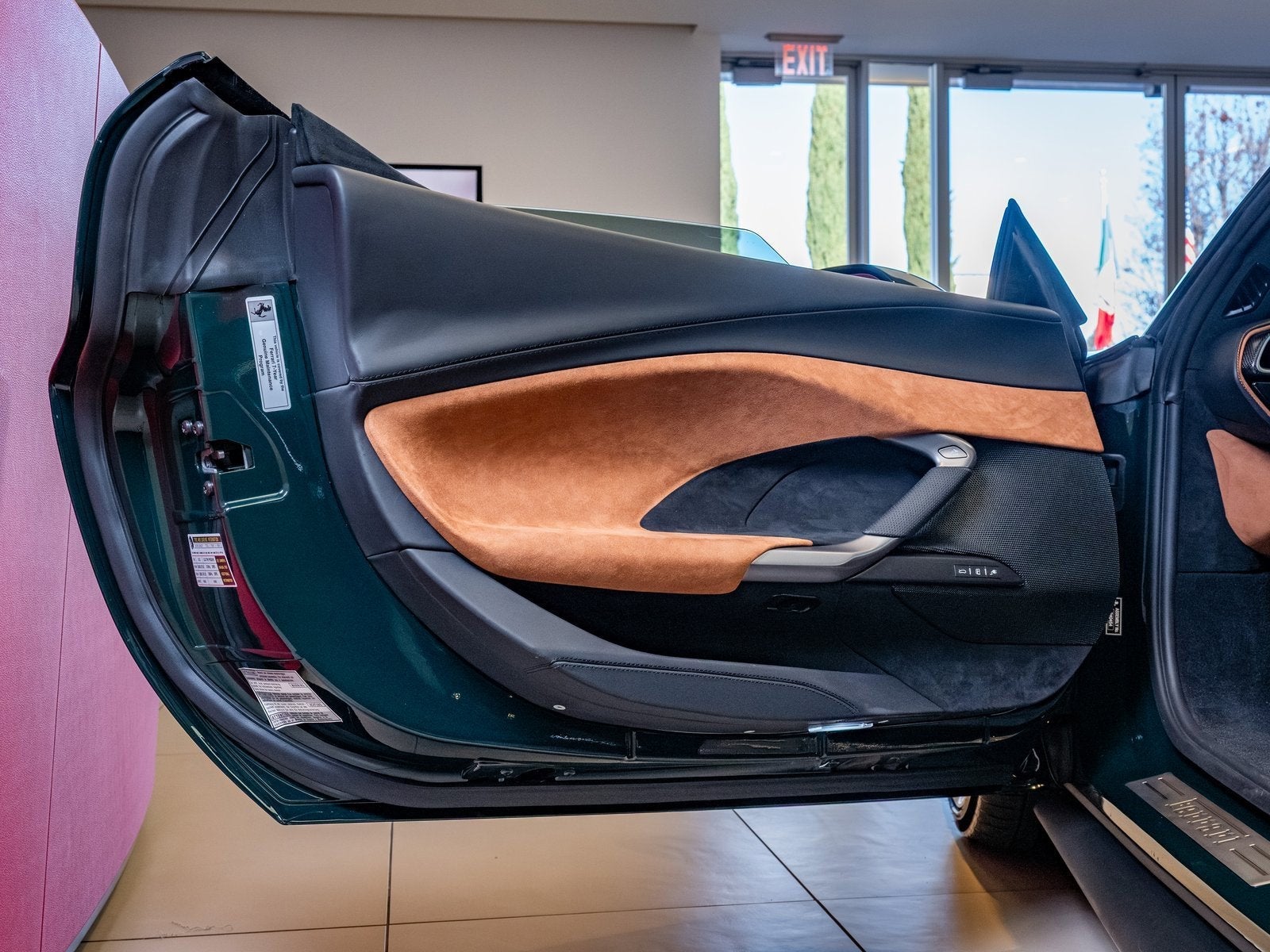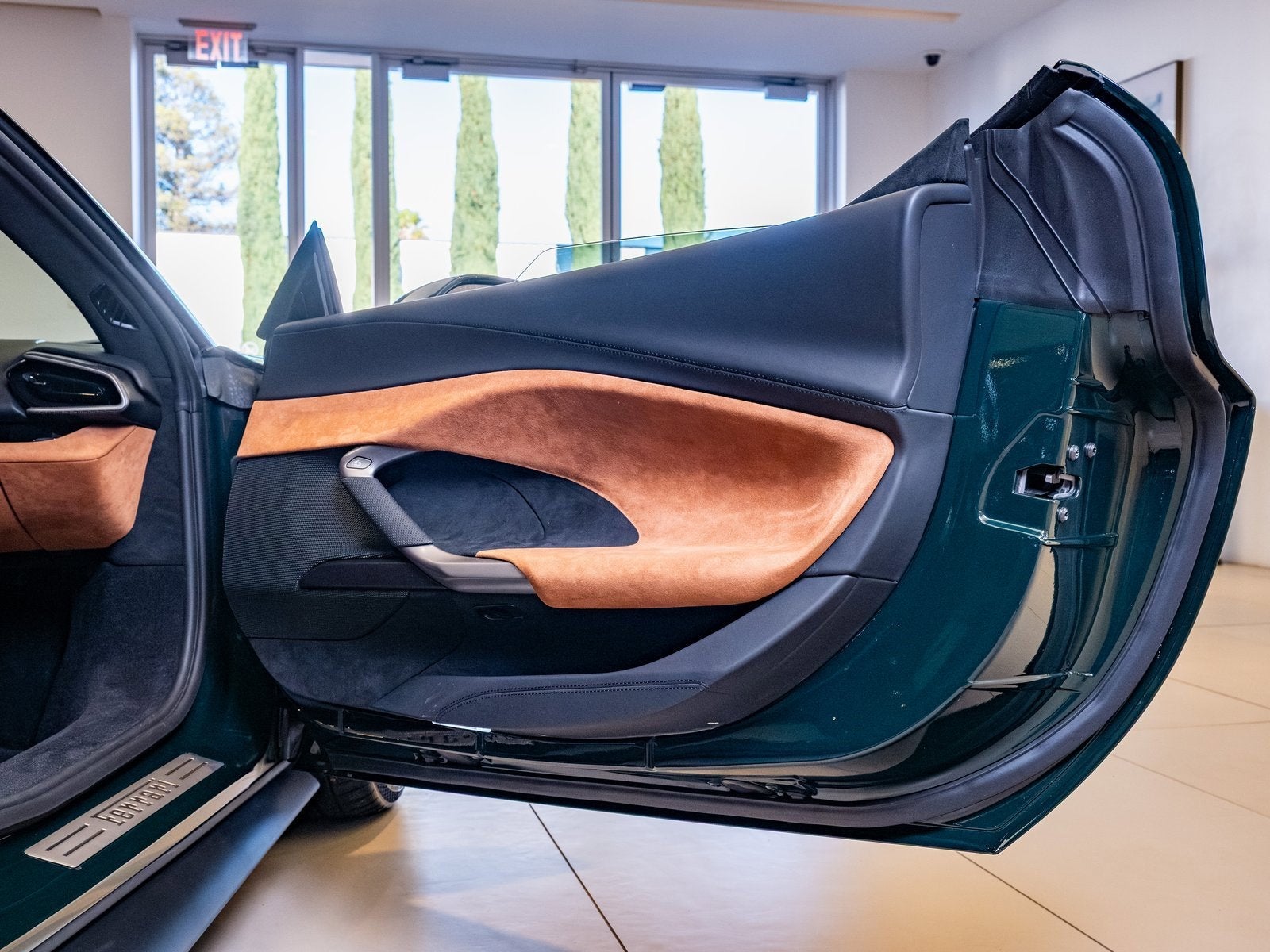 The cabin showcases Ferraris driver-focused layout, trimmed in elegant Cuoio leather and outfitted with performance and luxury in equal measure. The carbon fiber steering wheel with LEDs provides shift lights and integrated controls, while the carbon fiber center tunnel and Daytona racing seats in carbon fiber reflect a commitment to lightweight construction and race-ready design. Apple CarPlay keeps connectivity seamless for modern driving needs.