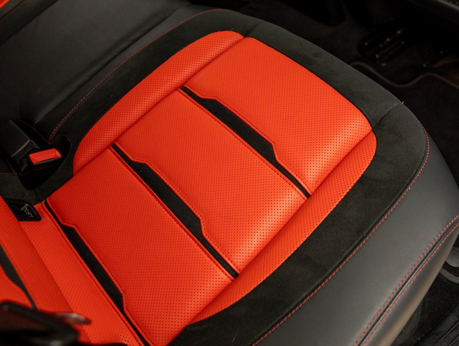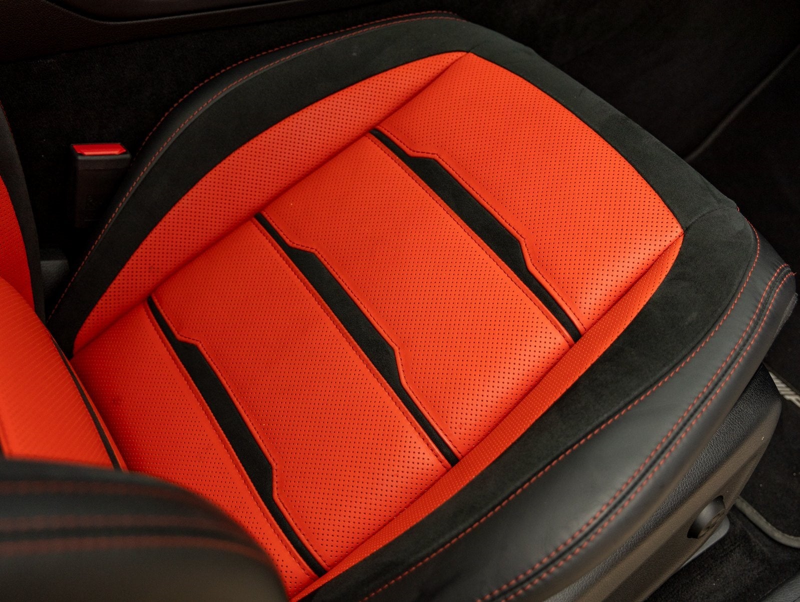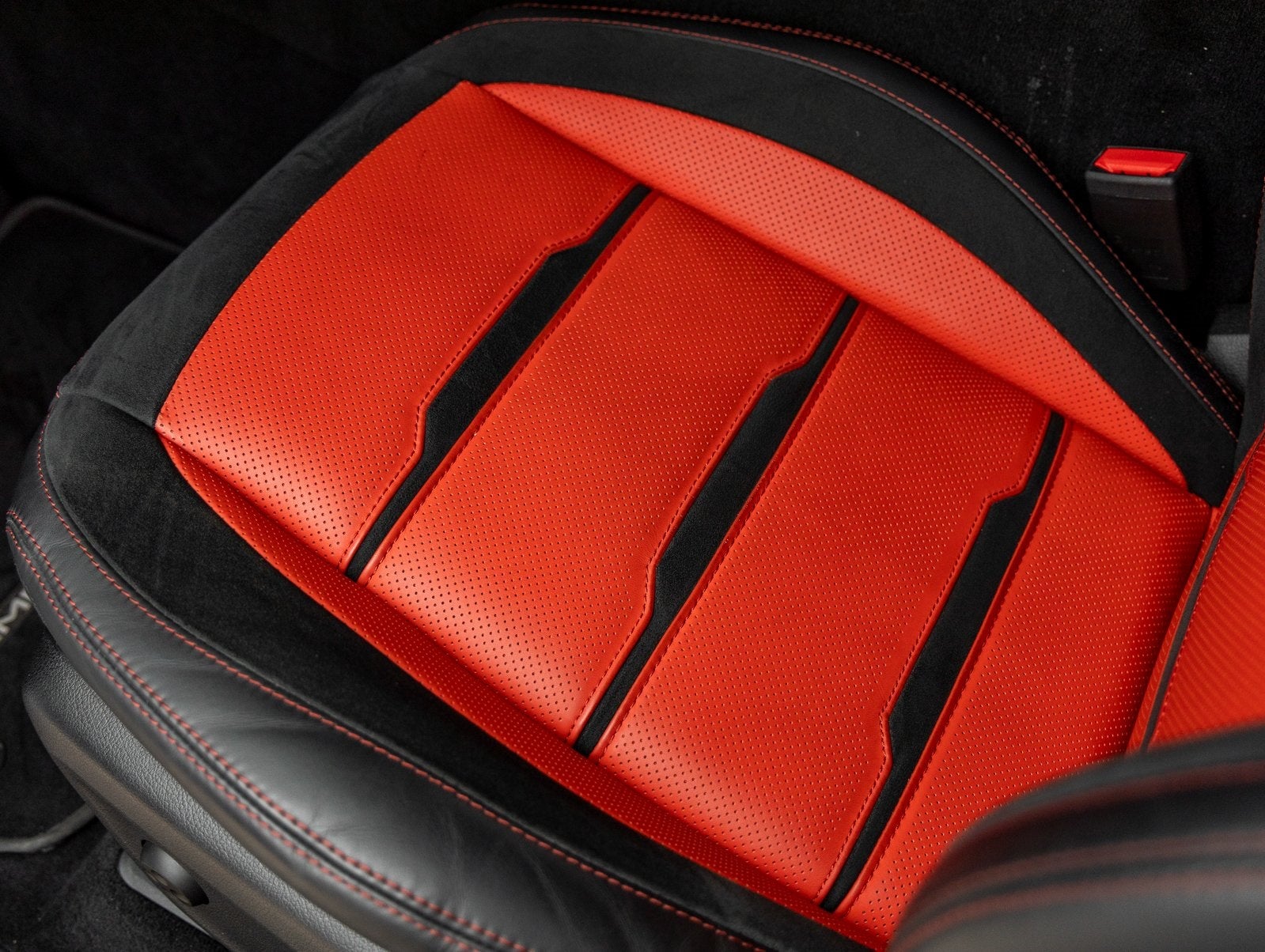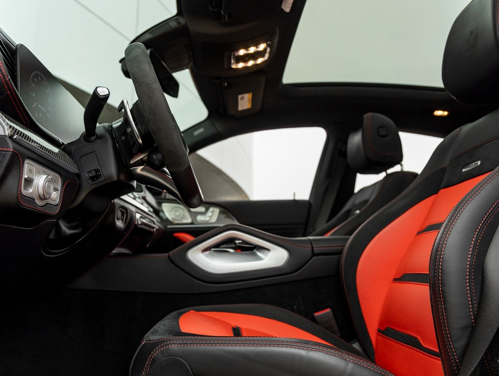 Premium Interior Appointments: Black and Red color scheme with AMG detailing, blending luxury with a bold, sporty aesthetic.