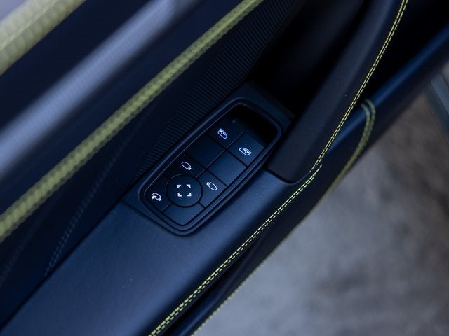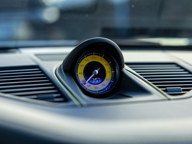 Inside, the cabin is richly appointed with a Leather Interior in Black, enhanced by the 930 Leather Package, extended leather dashboard and door panels, and a Deviated Stitching Interior Package in Racing Yellow. Additional highlights include Adaptive Sport Seats Plus (18-way) with memory, front ventilated seats, heated GT Sport steering wheel with matte carbon fiber trim, Racing Yellow seat belts, illuminated carbon fiber door-sill guards, and a Sport Chrono stopwatch and digital tachometer in Racing Yellow.