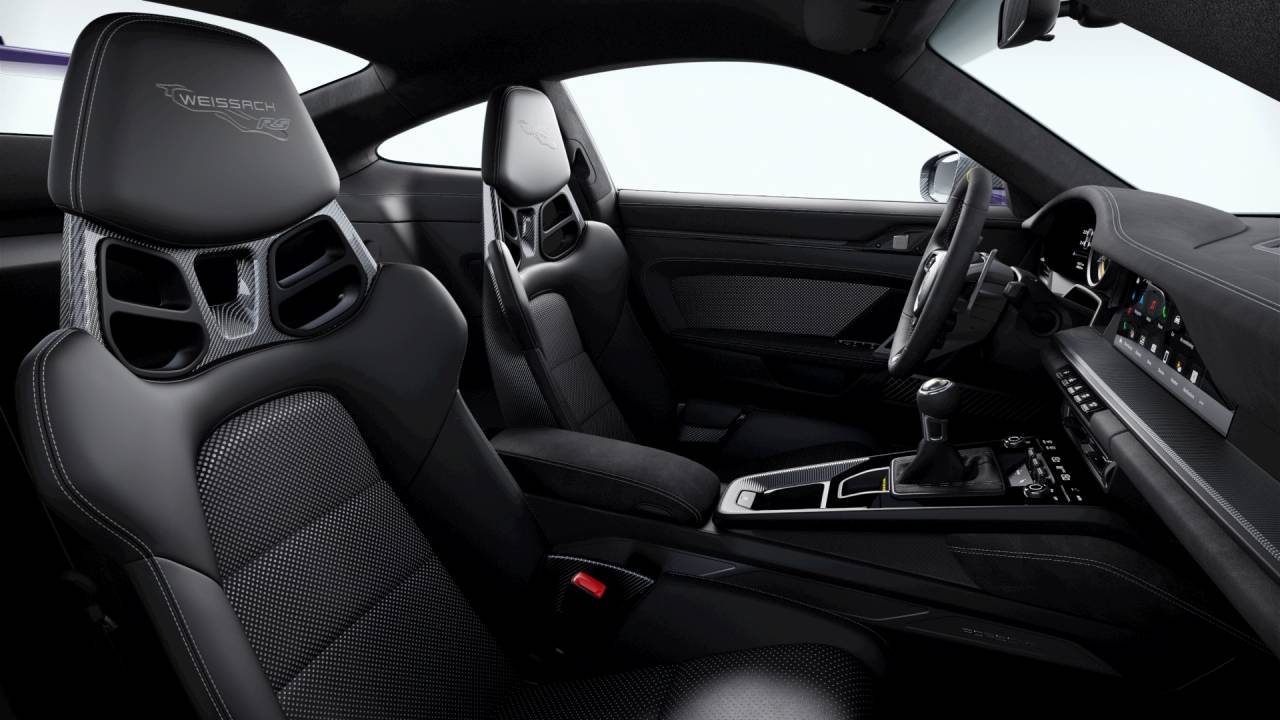 Additional interior appointments include matte carbon fiber illuminated door-sill guards, aluminum pedals and footrest, and carbon fiber floor mats with Racing Yellow leather edging. A fire extinguisher further underscores the track-ready nature of the GT3 RS while maintaining Porsches hallmark attention to detail.