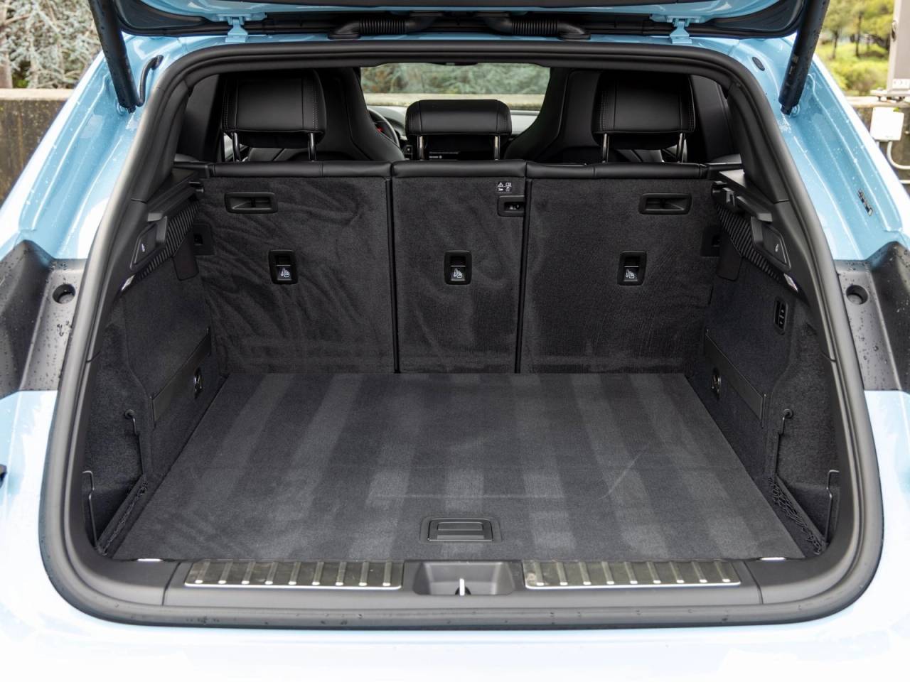 Exterior appointments reinforce the Macan Electrics bold presence. LED-Matrix Design Headlights provide striking illumination and visibility, while 22 RS Spyder Design wheels and wheel center caps with the colored Porsche Crest create a powerful stance. Side Blades painted in Exterior Color, roof rails in Black Aluminum, under door puddle light projectors, and a rear wiper complete the thoughtful and functional specification.