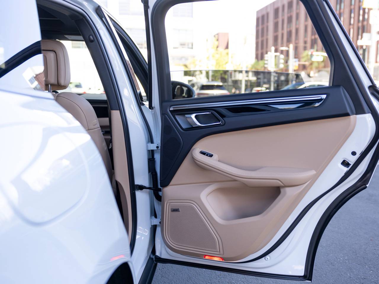 The exterior is equally well-appointed, featuring 20-inch Macan S wheels in highly polished dark titanium, side blades painted in exterior color, and roof rails in high-gloss black, all complementing the elegant Carrara White Metallic finish. A trailer hitch without tow ball adds versatility for those who need additional capability without compromising the vehicles sleek appearance.