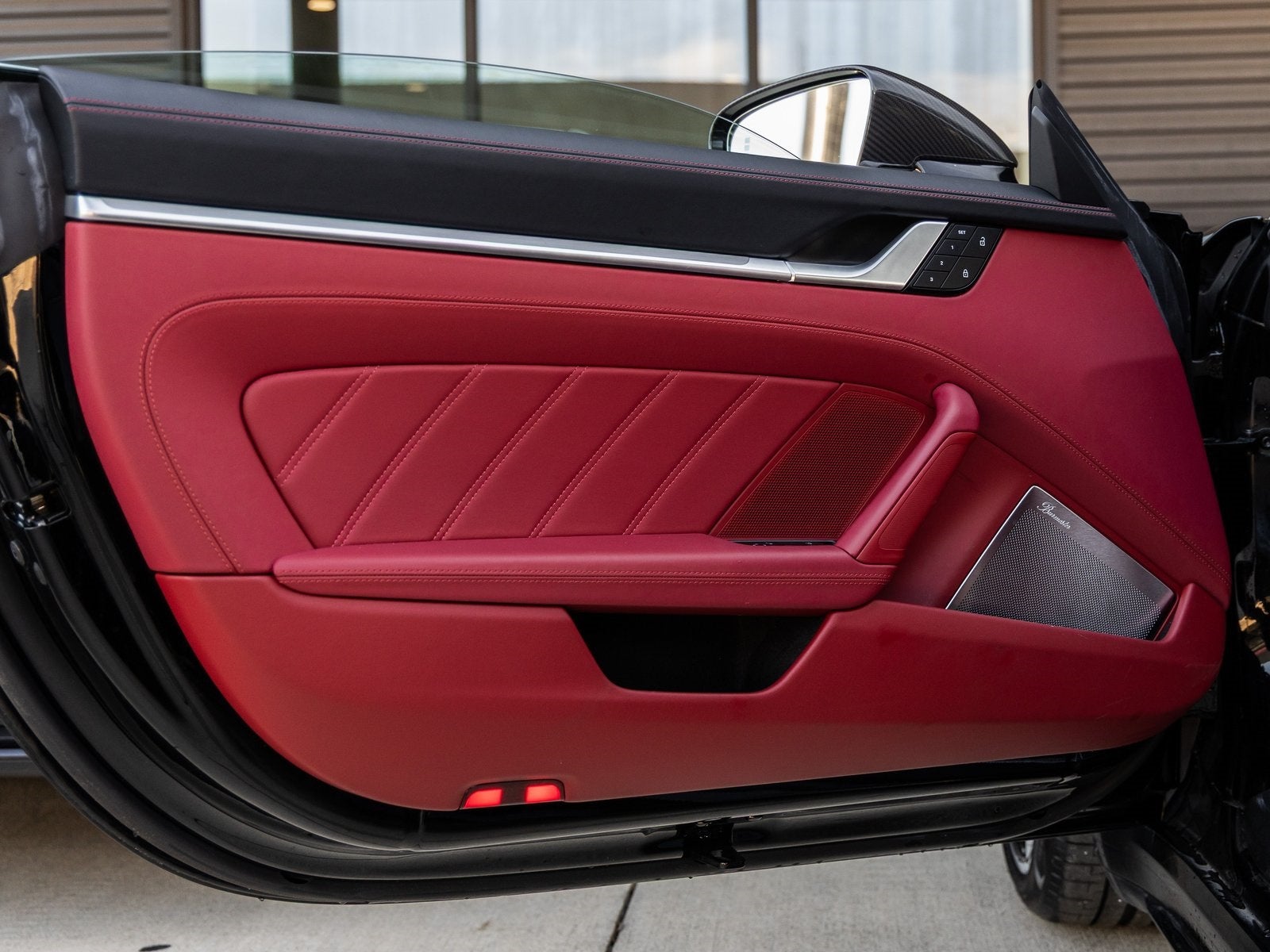 Inside, the Black/Bordeaux Red Leather Interior offers luxury with sporty details. The cabin features a Heated GT Sport Steering Wheel, Seat Belts in Bordeaux Red, Sun Visors in Leather, and Illuminated Brushed Aluminum Door-Sill Guards. A Burmester High-End Surround Sound System, Ambient Lighting, and Porsche Design Subsecond Clock complete the experience.