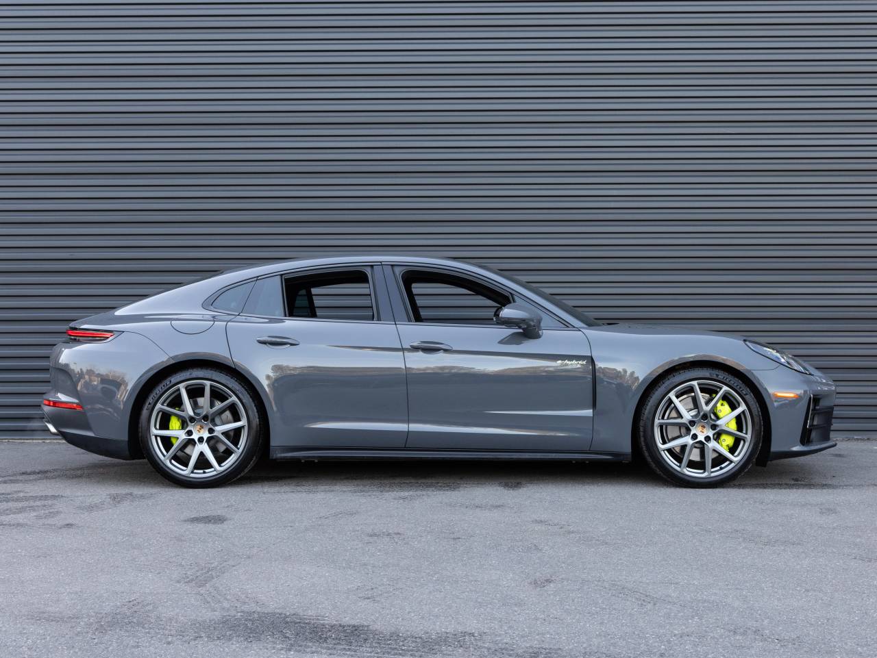 The exterior presents a clean and contemporary look with Exterior Mirrors in Exterior Color, Door Handle Inlays in Exterior Color, Window Trim in High Gloss Black, and subtle Acid Green Exterior Accents that distinguish its E Hybrid character. Its stance is completed by 21 Panamera SportDesign Wheels painted in Satin Dark Silver, along with the Exclusive Design Fuel Cap and PORSCHE Logo on Rear in High Gloss Black. Visibility is enhanced by HD-Matrix Design LED Headlights in Black.