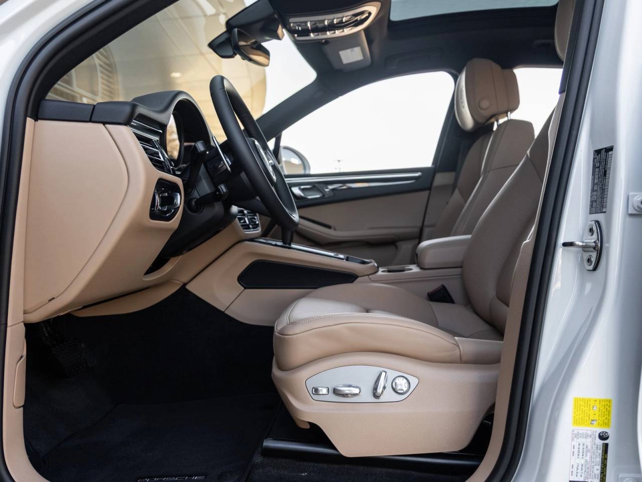 The Macan's exterior exudes confidence, especially in its White paint complemented by striking 20 Macan S Wheels in Jet Black Metallic. The LED Headlights including Porsche Dynamic Light System Plus (PDLS+) ensure crystal-clear illumination, while the Panoramic Roof System opens up the cabin to the sky, creating a sense of open-air freedom for all occupants.
