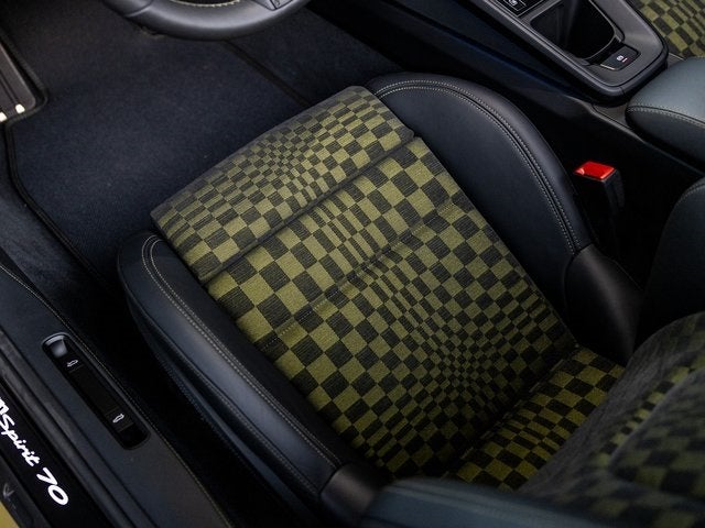 Finished in the striking Olive Neo exterior and paired with a remarkable Club Leather Interior in Basalt Black with Black/Olive Neo Pasha, this Spirit 70 Cabriolet is both a visual standout and a celebration of Porsche's iconic design lineage. Unique detailing such as Spirit 70 satin black decals, Pasha seat inlays, and Exclusive Design taillights highlight the model’s bespoke character.