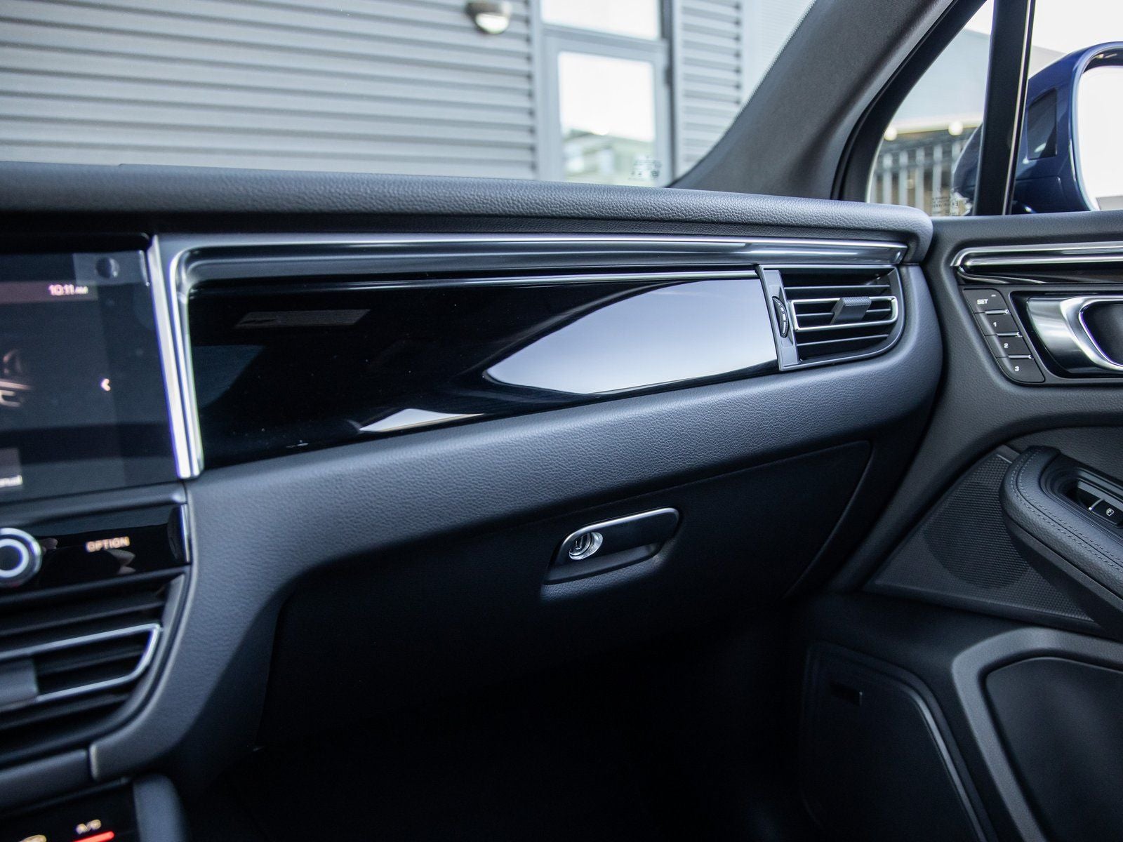 The Macan blends dynamic design with Porsches sporty DNA. Its Gentian Blue Metallic finish is complemented by 20 Macan S Wheels in Highly Polished Dark Titanium, LED Headlights in Black with PDLS+, Sport Tailpipes in Black, and Roof Rails in High Gloss Black. The Front Fascia Painted in Exterior Color sharpens the overall appearance, while the Panoramic Roof System brings open-air versatility.