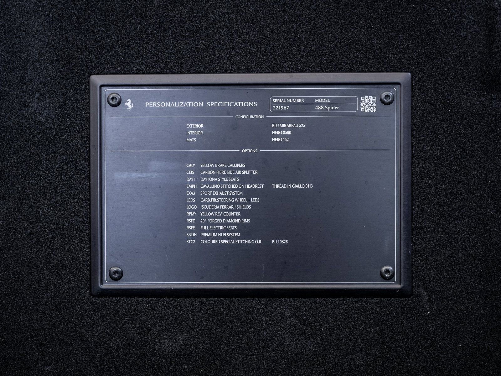 The cabin continues the performance-oriented theme, trimmed in premium Nero leather and highlighted by full-electric Daytona seats that blend classic Ferrari styling with modern comfort. At the center of the driving experience is the carbon fiber steering wheel with LEDs, offering integrated shift lights and direct control at your fingertips. The premium Hi-Fi system ensures every moment behind the wheel is accompanied by crystal-clear sound.