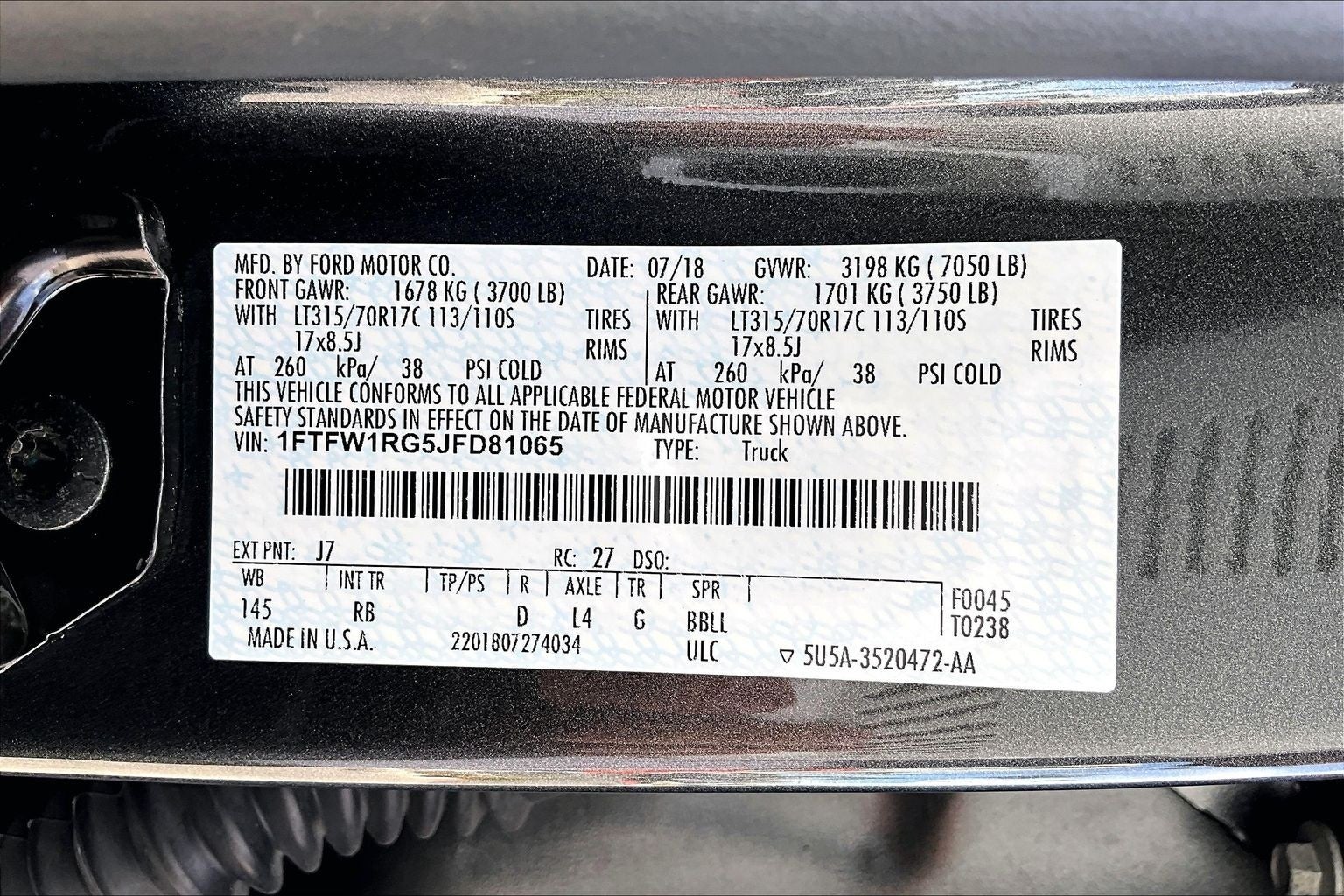 VIN: 1FTFW1RG5JFD81065