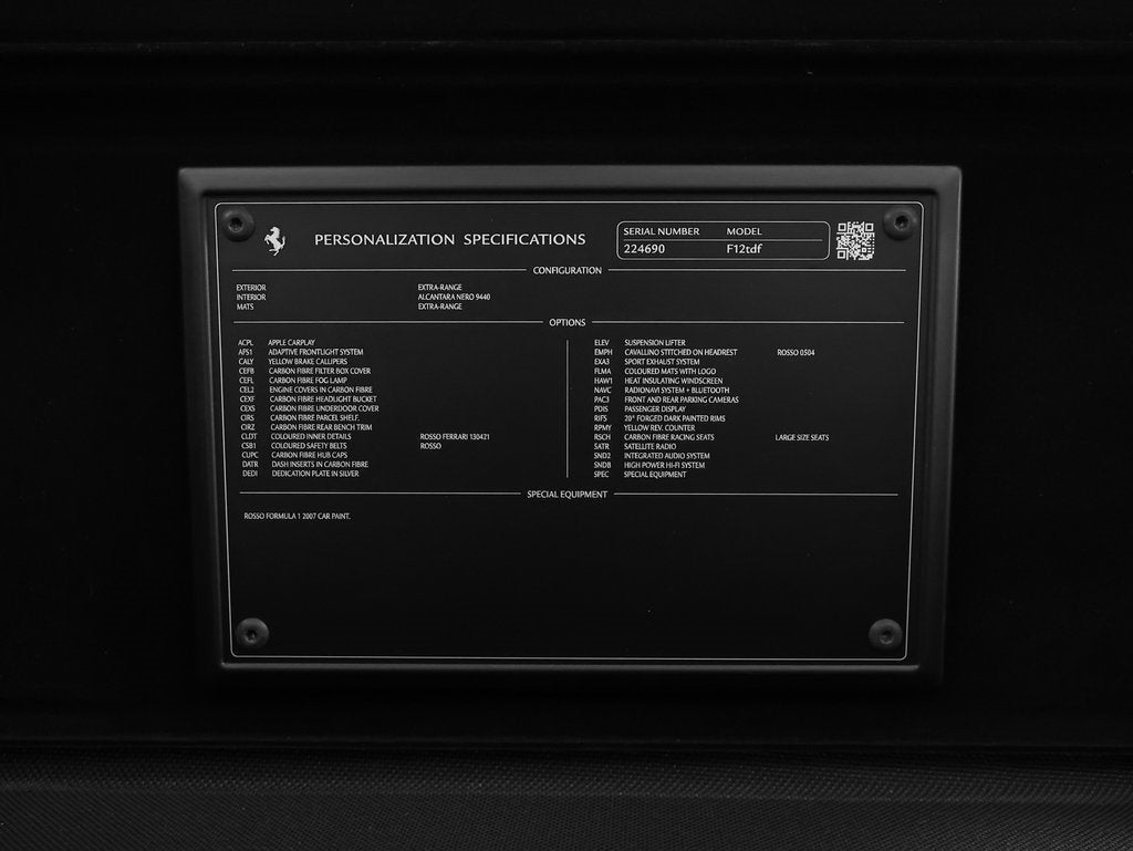 Performance: The Ferrari F12tdf is powered by a naturally aspirated 6.3-liter V12 producing a staggering 769 horsepower and 520 lb-ft of torque. Paired with Ferraris lightning-quick 7-speed dual-clutch F1 transmission, the F12tdf launches from 0-60 mph in approximately 2.8 seconds. Featuring advanced aerodynamics, rear-wheel steering, and extensive weight-saving measuresincluding abundant carbon fiberthe tdf delivers razor-sharp turn-in, extraordinary grip, and a spine-tingling V12 soundtrack. Built in extremely limited numbers, the F12tdf represents one of the most exhilarating and collectible front-engine V12 Ferraris ever produced.